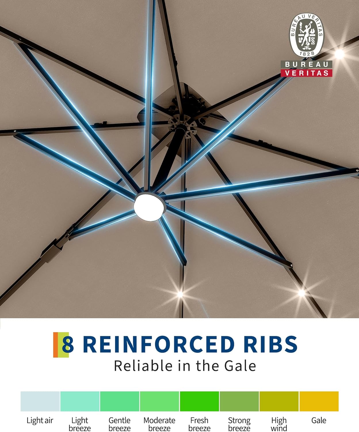 10' x 10' Heavy Duty Cantilever Patio Umbrella with Solar LED Lights & Weighted Base, 2-Tier Square Aluminum Offset Outdoor Umbrella with 360-Degree Rotation for Backyard, Deck, Pool, Tan