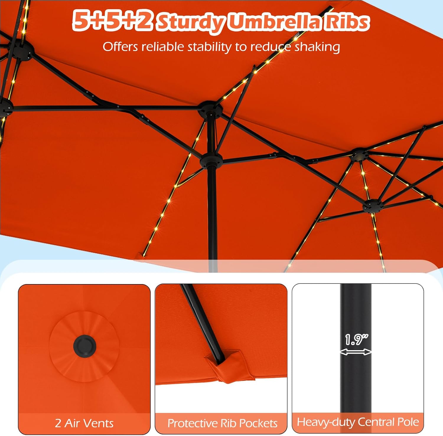 The double-side patio umbrella is designed to provide extensive shading coverage, making it perfect for a wide range of settings, such as backyard, poolside, deck. The 108 warm white LED lights are powered by a solar panel, which is perfect for entertaining day and night. Crafted with a high-quality polyester canopy and supported by 5+2+5 sturdy metal umbrella ribs, the extra large outdoor umbrella ensures effective sun protection and long-lasting performance. Moreover, the 2 air vents promote airflow for a cool experience and improved stability. Additionally, the 15.5 ft garden umbrella features a convenient 2-section design and a user-friendly crank handle, making assembly and opening a breeze. Also, the fixing tie allows for compact storage when not in use.