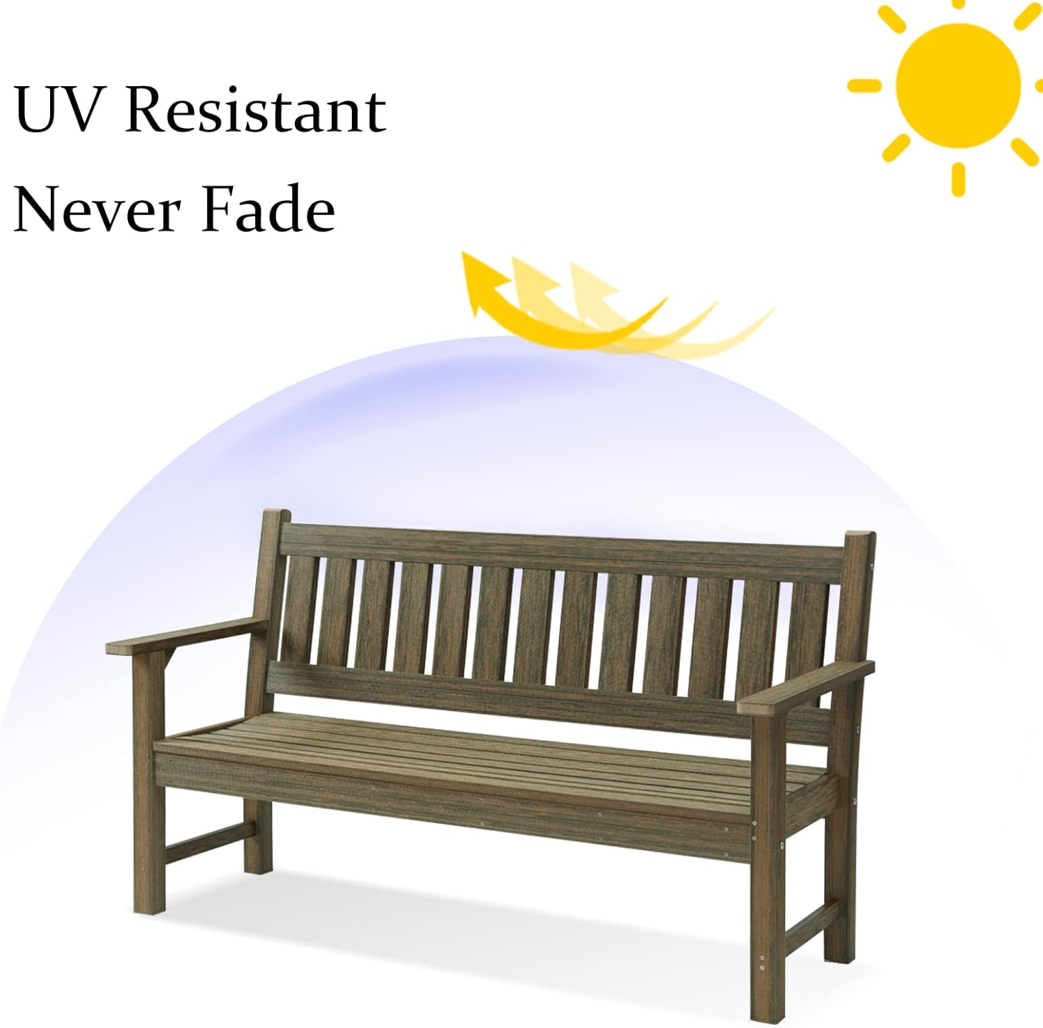 Weather Resistance: Polyethylene material can prevent fading, rot, warping, and dents, you can keep the 3-person park bench outdoors in all kinds of weather including hot sun, heavy snow, heavy rain, and strong winds, without the worry of mo-ld, mil-dew, rot or refinishing.