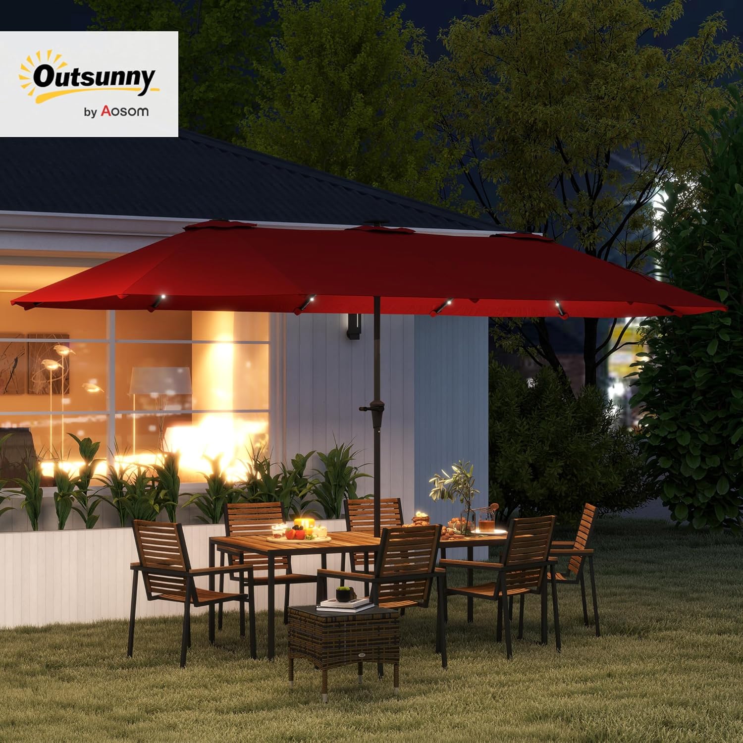 Turn your garden into a serene nighttime retreat with the Outsunny outdoor patio umbrella with lights! Designed with integrated lights to create a warm, inviting ambiance, it features 180 gsm polyester fabric with UPF30+ rating for UV protection. The powder-coated steel pole and 12 steel ribs offer reliable support. Whether you're enjoying a dinner party or relaxing with family, the rectangle patio umbrella with solar lights provides a delightful outdoor experience.